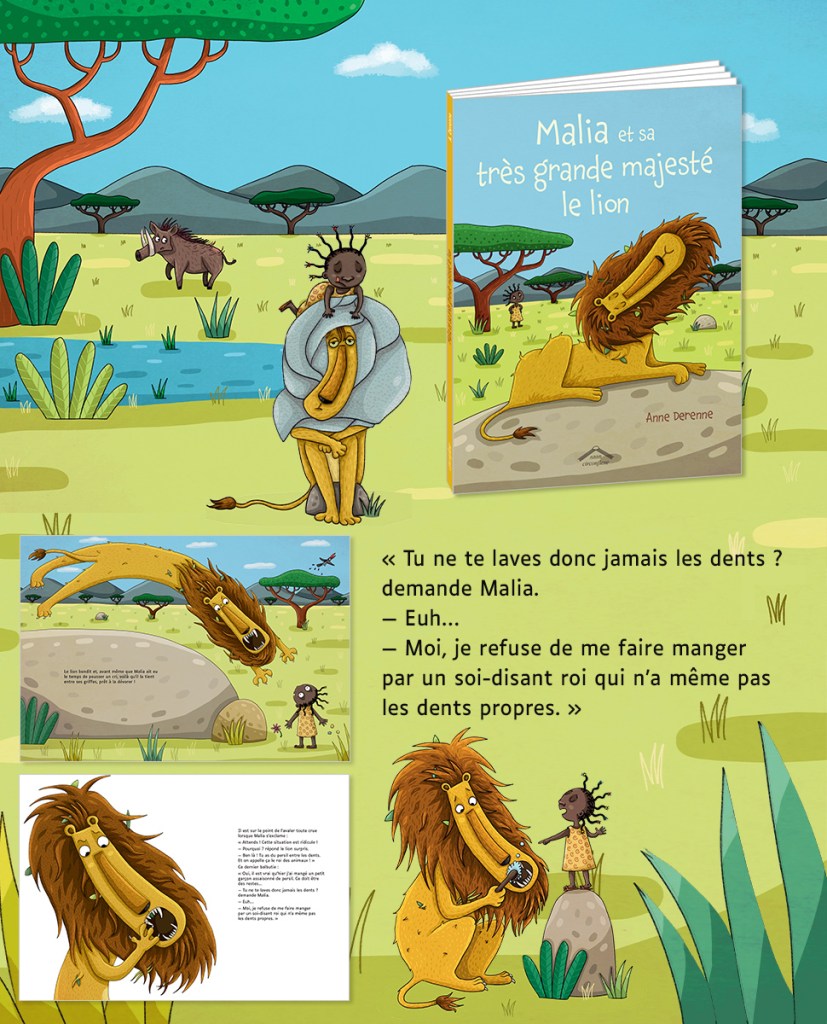 Alors qu’elle se promène tranquillement dans la savane, Malia tombe nez à nez avec le roi en personne : le lion ! S’apprêtant à être dévorée, elle proteste : Hors de question de se faire manger par quelqu’un d’aussi sale !