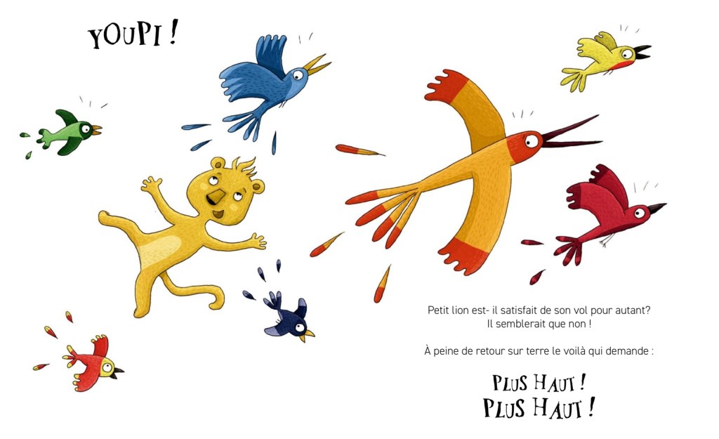 Plus haut ! Plus haut ! Papa Lion, qui veut absolument faire plaisir à son petit, part alors demanderde l’aide à son ami Singe puis à Rhinocéros… et petit à petit à tous les autres animaux de la savane. Petit Lion finira-t-il par trouver satisfaction ? »